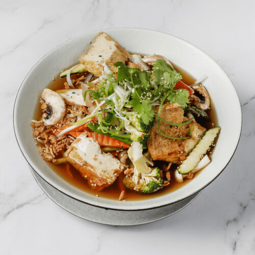 Ramen-Nudelsuppe mit zartem Tofu, frischem Gemüse, Röstzwiebeln und Koriander